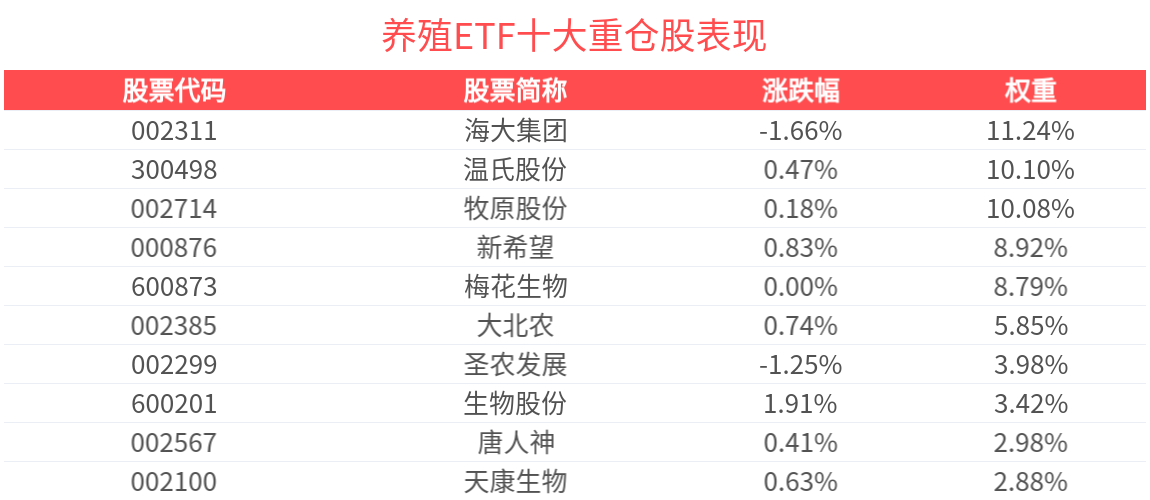 數據顯示,截至2025年4月30日,中證畜牧養殖指數(930707)前十大權重股分別為海大集團(002311)、牧原股份(002714)、溫氏股份(300498)、梅花生物(600873)、新希望(000876)、大北農(002385)、聖農發展(002299)、生物股份(600201)、天康生物(002100)、唐人神(002567),前十大權重股合計佔比69.38%。
