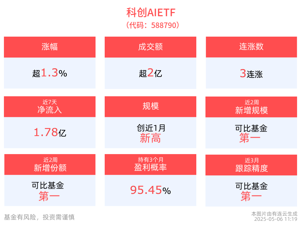 截至2025年5月6日 11:19,上證科創板人工智能指數(950180)強勢上漲1.42%,成分股有方科技(688159)上漲10.92%,芯海科技(688595)上漲10.29%,金山辦公(688111)上漲5.56%,虹軟科技(688088),天準科技(688003)等個股跟漲。科創AIETF(588790)上漲1.34%, 沖擊3連漲。最新價報0.6元。拉長時間看,截至2025年4月30日,科創AIETF近2周累計上漲3.84%。流動性方面,科創AIETF盤中換手8.09%,成交2.23億元。拉長時間看,截至4月30日,科創AIETF近1年日均成交2.87億元,排名可比基金第一。
