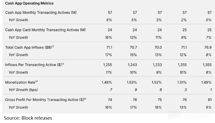 核心經營指標上,Cash App 的月活數量已連續 5 個季度維持在越 5700 萬左右,本季同比增長正式歸於 0%,再度強調了Cash App 的用增已遇到顯著的瓶頸。