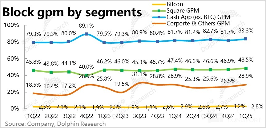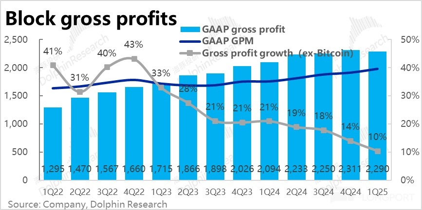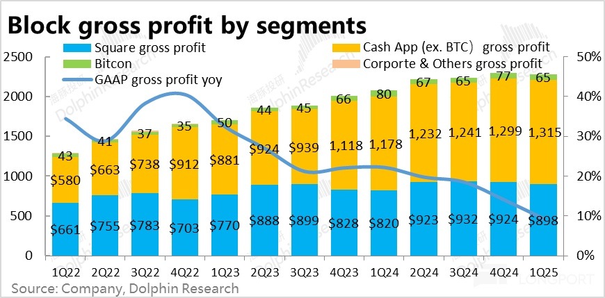 分板塊看,Cash App 板塊(剔除 BTC 業務後)實現毛利潤 13.2 億美元,同比僅增長 12%,遠低於市場預期以及上季度約 16% 的增速。至於表現一直不好的 Square 板塊,本季毛利潤則增長了 9.5%,反稍好於預期,但不改變整體趨勢。整體上,在收入增長明顯下滑的情況下,通過經營槓桿,釋放出跑贏收入的利潤增長。