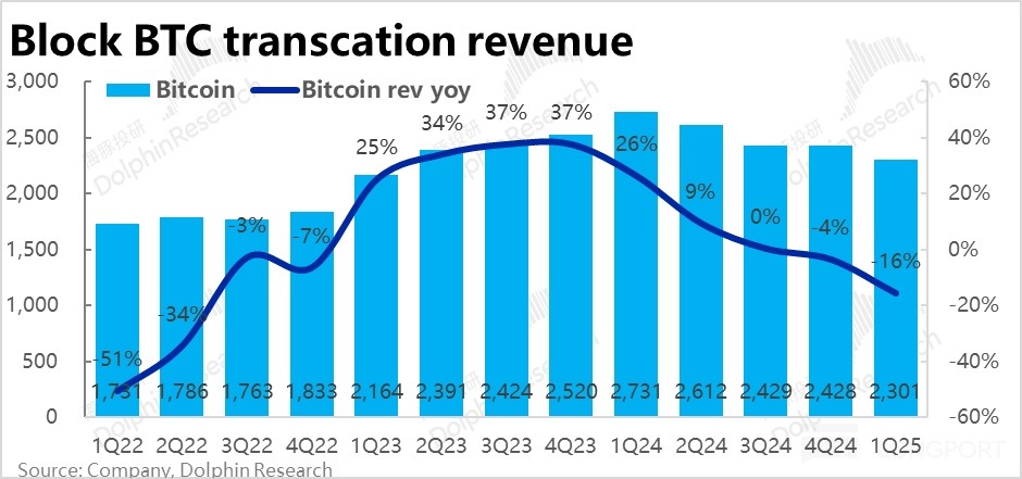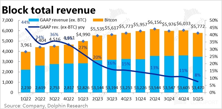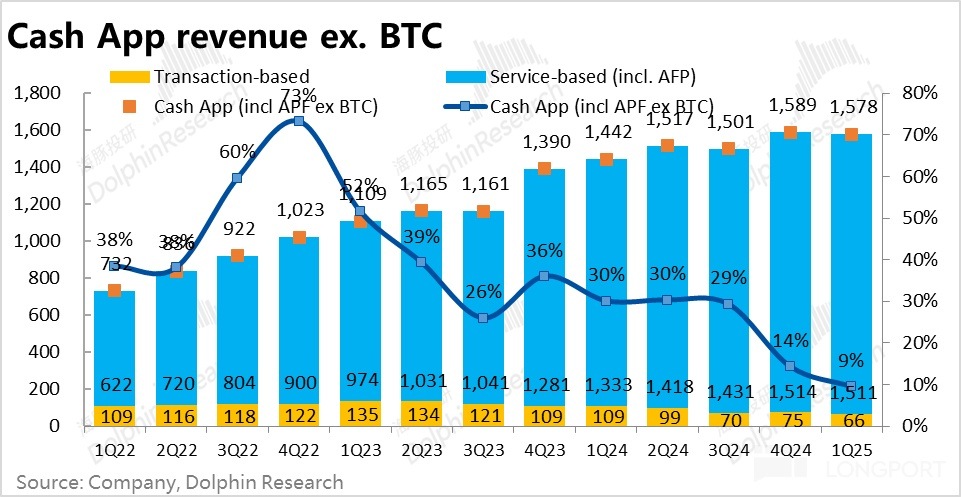 具體來看,剔除 BTC 交易後的 Cash App 核心營收,本季僅同比增長 9.4% 到$15.8 億,同樣滑入了個位數區間。遠低於上季實際和本季市場預期都約 14% 的增速。