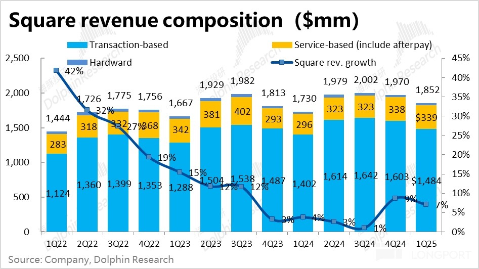 3、Square 繼續大跨步走低,SMB 企業更受傷:面向商戶的 Square 板塊,則 「不出意外」 地在繼續變差。本季度收入同比增長 7.1%(其中有約 1pct 的匯率逆風影響,和復活節錯位的影響),比上季的 8.7% 放緩並不多。但市場預期的是本季增長會觸底再加速到 9.6%,實際繼續滑坡已屬方向性的錯判。
