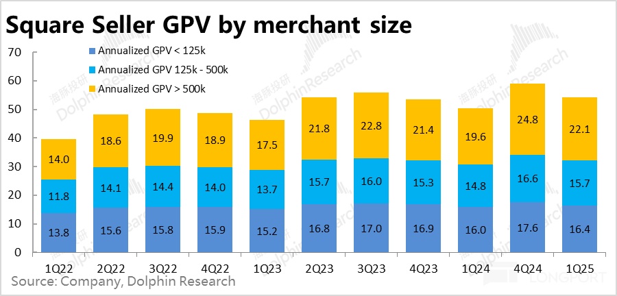 佔大頭的Square 生態内支付額$541 億,同比增長 7.3%,比上季減速 2.6pct,雖已相對堅挺,但也不改仍在放緩的事實。進一步細分,Square客戶中規模最小的商戶(年支付額低於$12.5 萬)本季的支付額僅同比增長了 2.5%,中型和中大型商戶則分別同比增長 6% 和了 13%。可見在宏觀逆風下,越是小型企業或商戶受到的打擊更加嚴重。