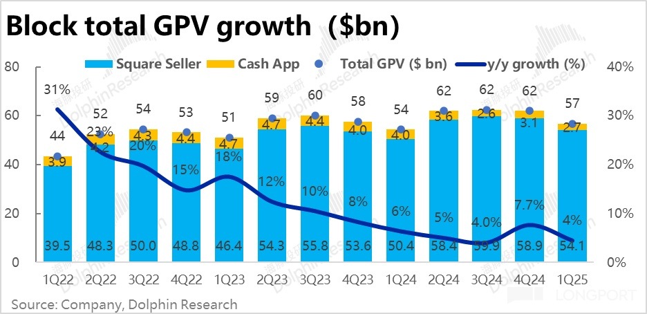 2、僅存支柱 Cash App 也 「倒了」:近幾個季度以來,Square 板塊連續數個季度僅個位數% 增長的表現讓市場已對其並不抱過多期待。公司近期的業績一直是靠增長強勁的 Cash App 板塊的支撐(直到 3Q24 Cash App 板塊仍有僅 30% 的營收增速)。因此本季度 Cash App 板塊的增長同樣跳水式滑坡,是本季業績反映出的最大問題。
