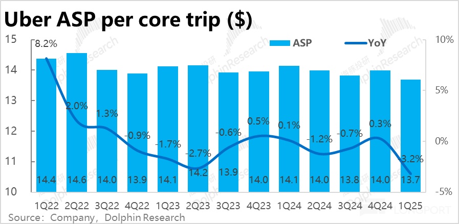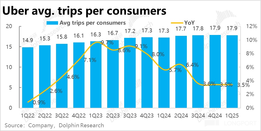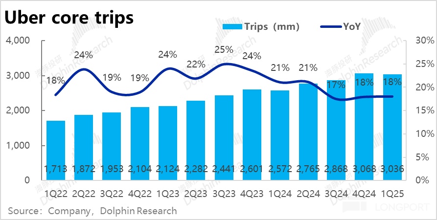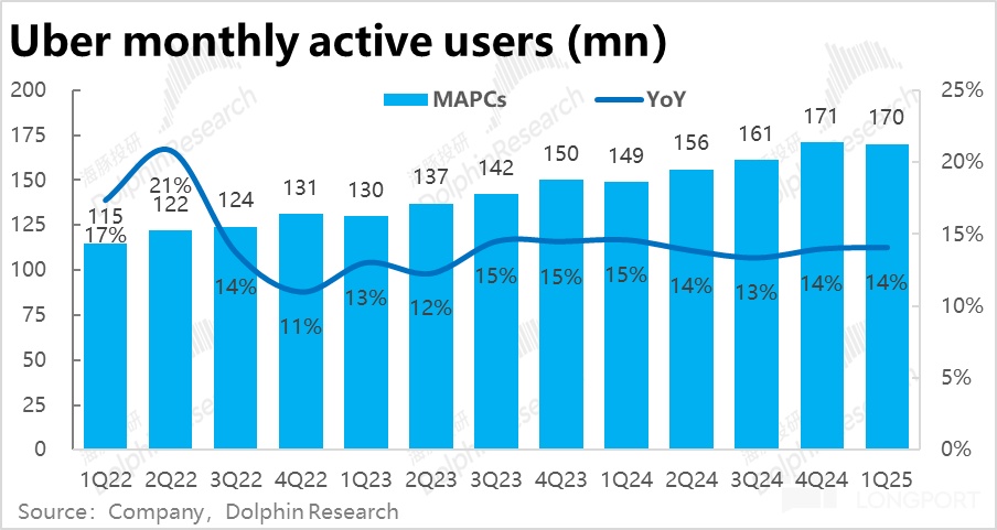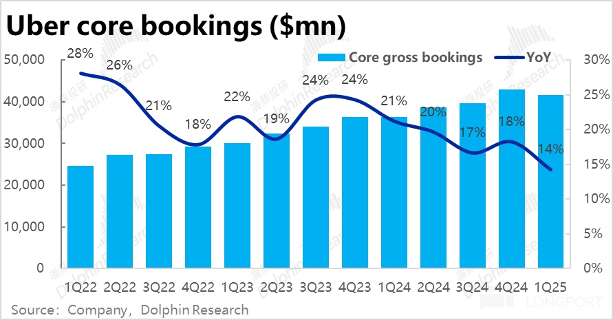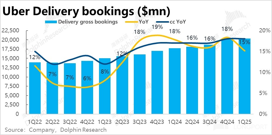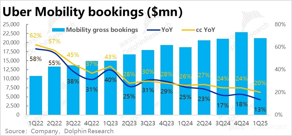 核心指標--訂單額(Gross booking)本此的最大問題在於網約車(Mobility)業務增長超預期的顯著放緩。本季同比增速僅 13.5%,環比滑坡 4.7pct,也明顯低於並不高市場預期的 15%。即便剔除匯率影響後,增速同樣是從 24% 滑坡到 20%,因此並非主要是受逆風匯率的影響,而是實際業務上的放緩。