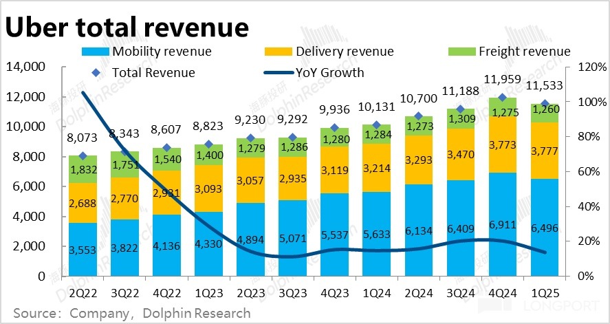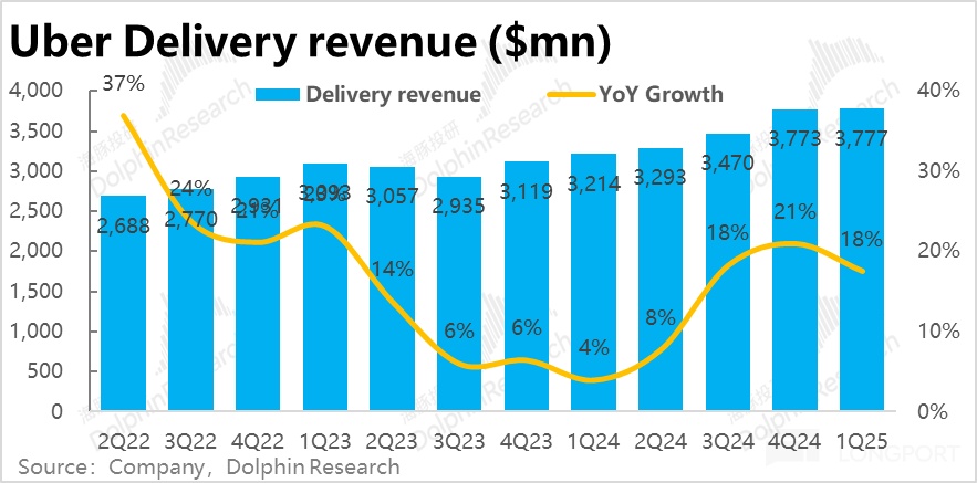 但對應的,當季業績好的方面則體現在:1)首先外賣業務無論是訂單額還是收入增速都保持著堅韌的增長。盡管高頻數據顯示餐飲消費不佳,昨日 DoorDash 的業績也驗證了這一觀察,但 Uber 卻逆勢交出了不俗的表現。