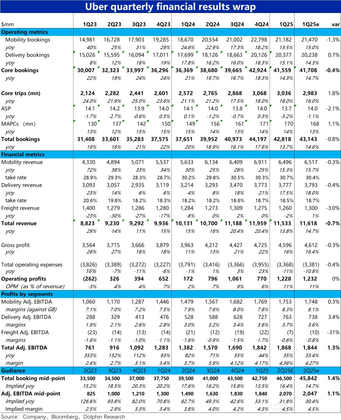 北京時間 5 月 7 日晚美股盤前,「國際滴滴」$優步(UBER.US) 發佈了 2025 年 1 季度財報,概括來看,當季業績表現有些瑕疵,但對下季度的指引超預期對沖了當季不佳表現的負面影響,詳細要點如下: