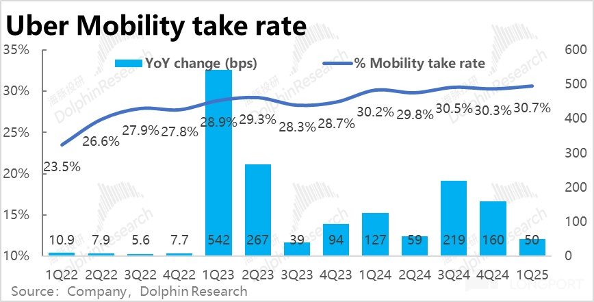 收入角度,打車業務不僅是訂單額增速明顯放緩,收入增速更是跳水式下降。本季同比增速僅 15%,是疫情後最低的單季增速。背後誘因是,本季打車業務 的 take rate 同比僅增長了 50bps,相比過去兩個季度 160bps 以上的提升幅度大幅收窄。