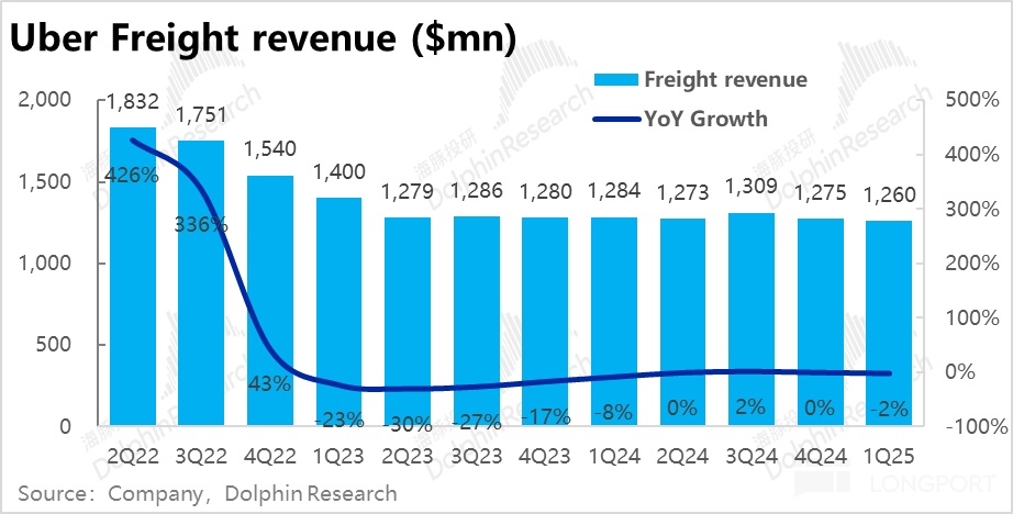 Uber 貨運業務,本季度營收約 12.5 億元,同比略降 2%,增長仍無起色。