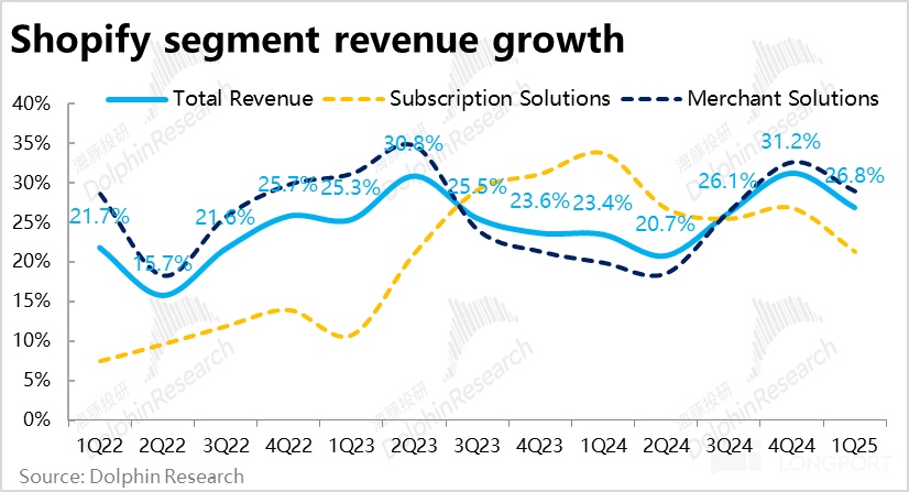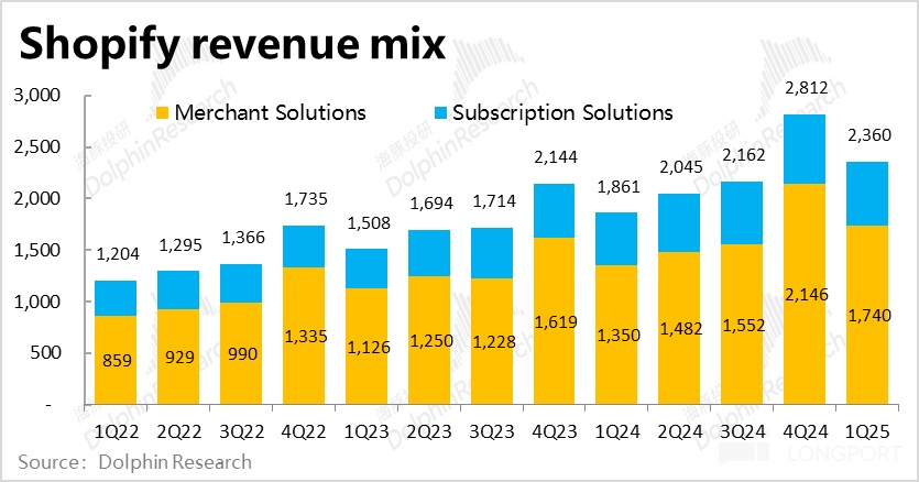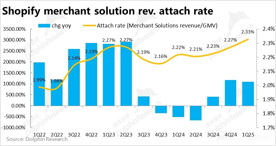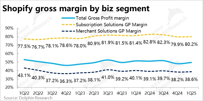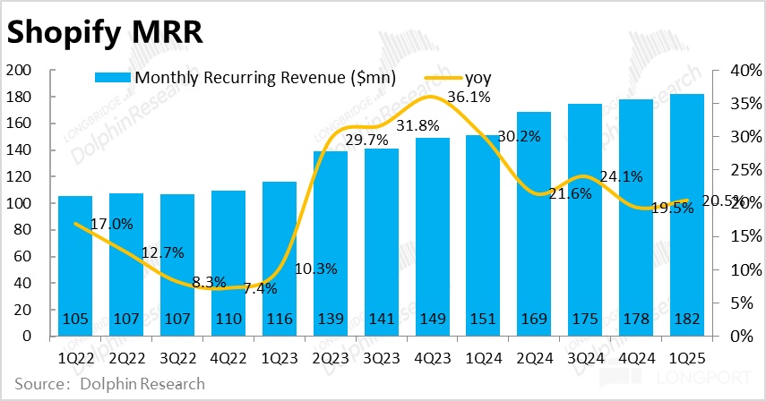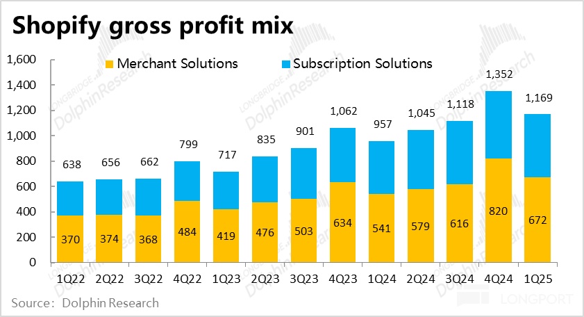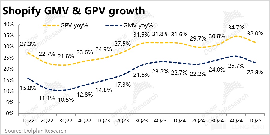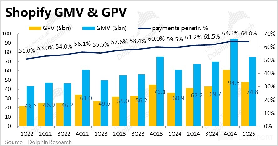 關鍵經營指標—Shopify 本季的 GMV 總額為$748 億,同比增長 22.8%。雖較上季度放緩約 2.9pct,但與市場預期是大體一致的。和市場業績前的預期類似,關稅在 1Q 尚未實際性影響公司業務和消費者的購物意願。