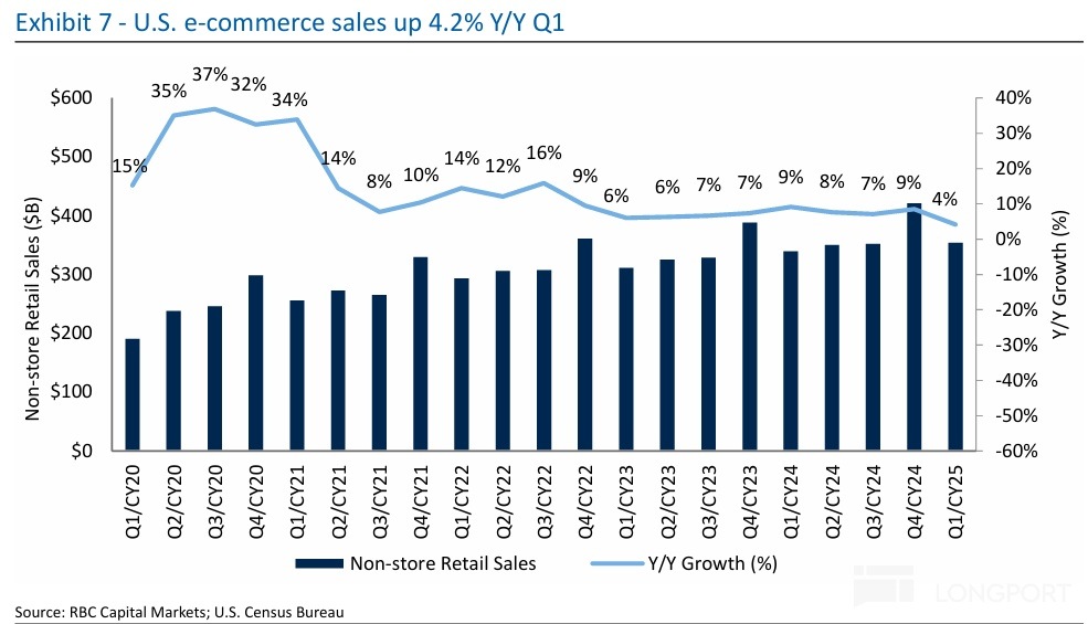 考慮到美國整體綫上消費(以非門店零售為參考指標)的增速是從 4Q 的 9% 下降到本季的 4%,因此本季公司的 GMV 增速放緩更多只是反映了宏觀消費情緒的走弱,尚沒實際性體現出關稅帶來的負面影響。