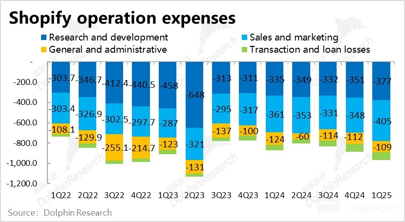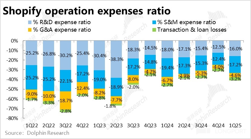 除了毛利率收縮,本季Shopify 的經營費用支出也比預期的 9.6 億稍多些,實際支出約$9.7 億,佔收入比重約 40.9%,處於先前指引 41%~42% 的下限。