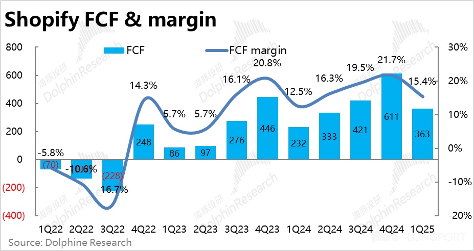 但由於毛利率超預期的下滑,Shopify 的利潤率雖仍在提升周期中,但提升幅度比預期的要低。公司關注的自由現金利潤率本季為 15.4%,同比提升 1.9pct,但低於市場預期的 15.6%。在營收超預期的情況下,最終自由現金利潤$3.63 億反而略微低於預期的 3.65 億。