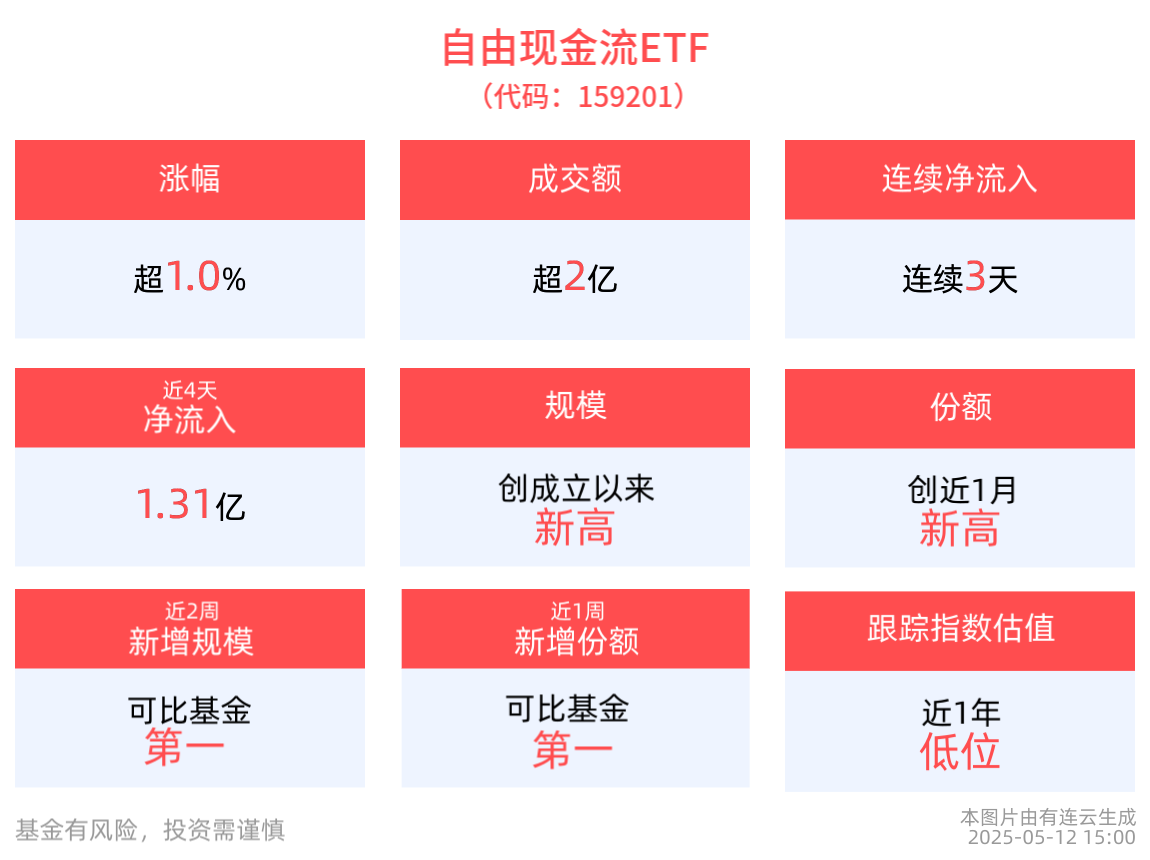 從資金淨流入方面來看,自由現金流ETF近3天獲得連續資金淨流入,合計「吸金」1.58億元,日均淨流入達5254.95萬元;規模方面,自由現金流ETF最新規模達34.34億元,創成立以來新高。