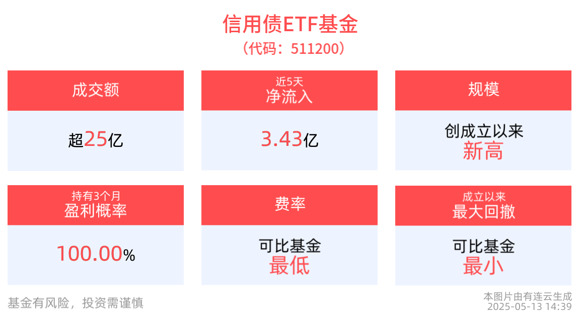 截至2025年5月13日 14:39,信用債ETF基金(511200)上漲0.02%,最新價報100.5元。