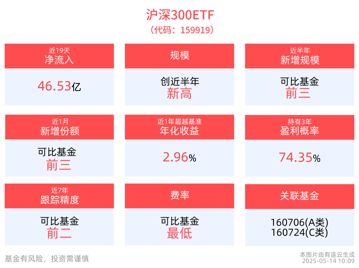 規模方面,滬深300ETF最新規模達1702.92億元,創近半年新高。份額方面,滬深300ETF近1月份額增長12.34億份,實現顯著增長,新增份額位居可比基金前3。資金流入方面,拉長時間看,滬深300ETF近19個交易日内,合計「吸金」46.53億元。