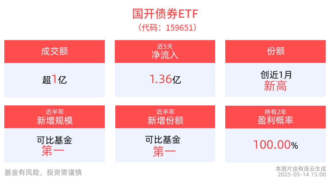 拉長時間看,截至2025年5月14日,國開債券ETF近半年累計上漲1.02%。