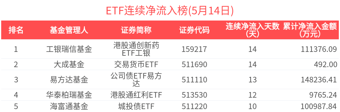 近期連續淨流入的ETF基金有89只,居前的為港股通創新藥ETF工銀(14天)、交易貨幣ETF(14天)、公司債ETF易方達(13天)、港股通紅利ETF(12天)、城投債ETF(10天),分別淨流入11.14億元、492.00萬元、14.82億元、9765.24萬元、10.10億元。