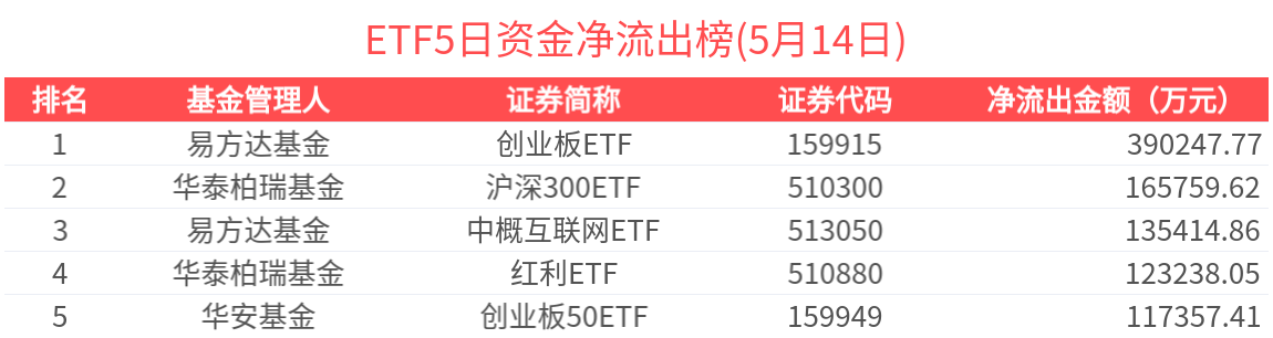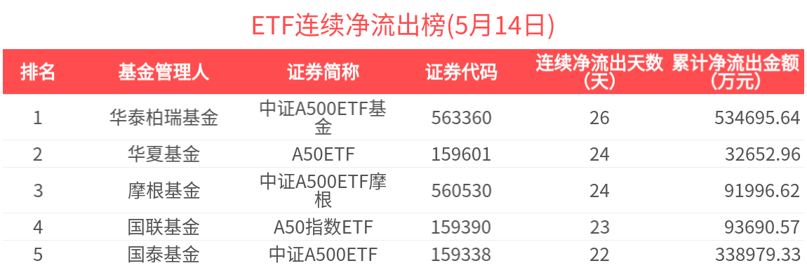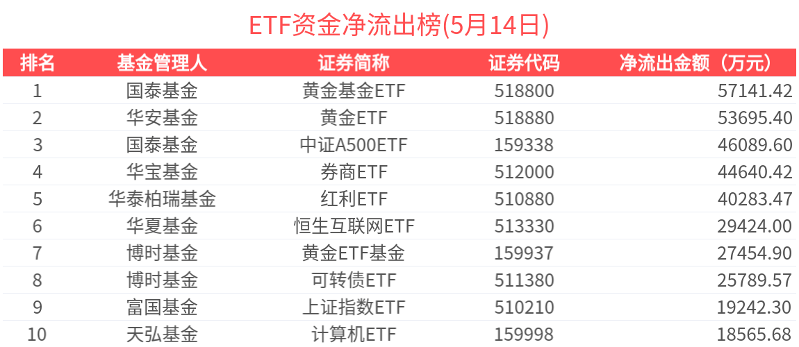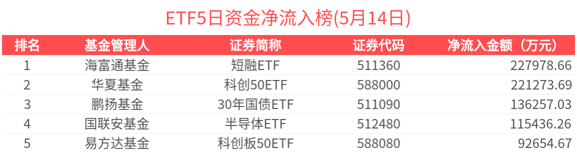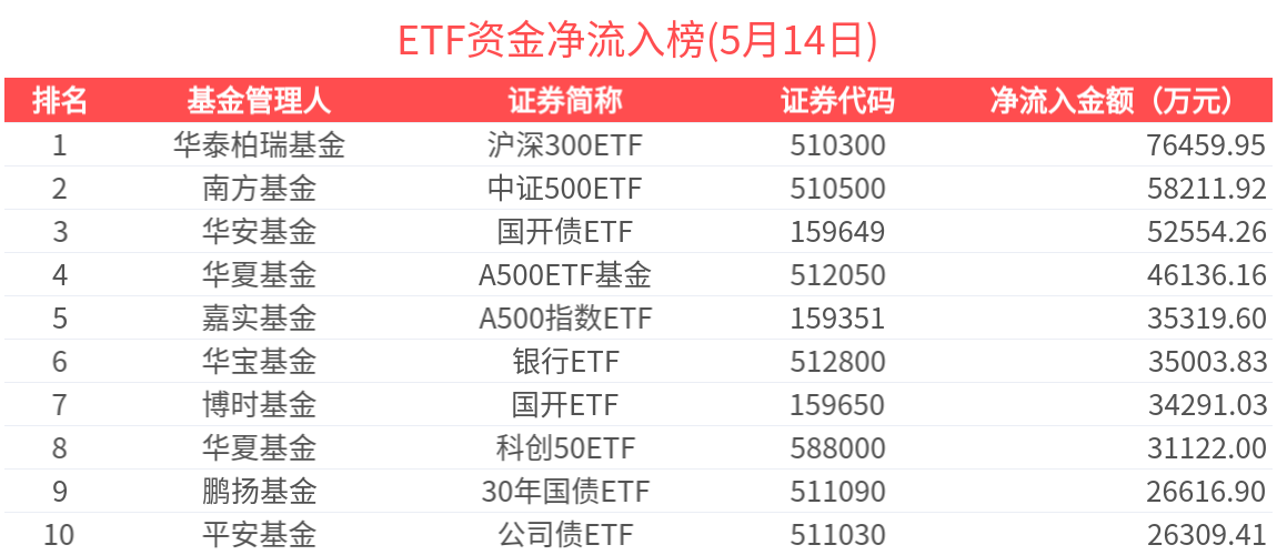 2025年5月14日共240只ETF基金獲資金淨流入,380只ETF基金淨流出。淨流入金額超1億元的有19只,滬深300ETF(510300.SH)、中證500ETF(510500.SH)、國開債ETF(159649.SZ)、A500ETF基金(512050.SH)、A500指數ETF(159351.SZ)資金顯著流入,分別淨流入7.65億元、5.82億元、5.26億元、4.61億元、3.53億元(淨申購份額*單位淨值)。