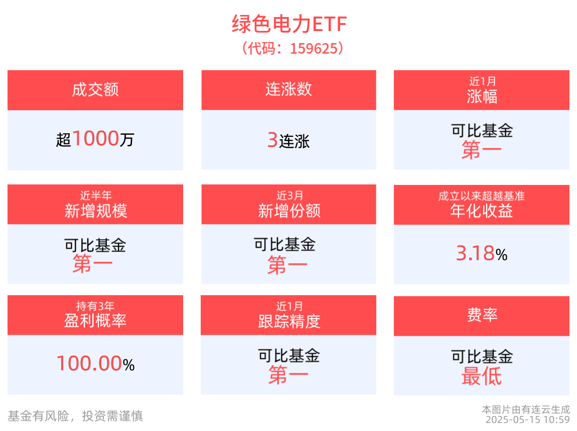 截至2025年5月15日 10:59,國證綠色電力指數上漲0.01%,成分股京運通上漲7.58%,華能國際上漲1.21%,湖南發展上漲1.09%,明星電力上漲1.05%,國電電力上漲0.88%。綠色電力ETF(159625)沖擊3連漲。