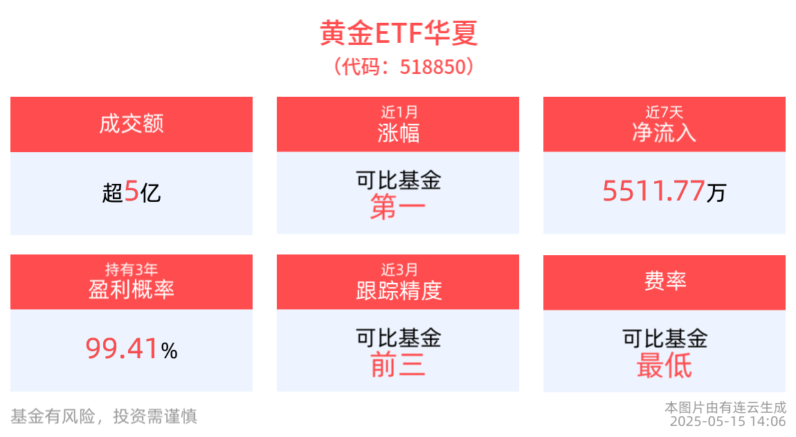 成交額超5億元,黃金ETF華夏(518850)近3月漲幅居可比基金首位