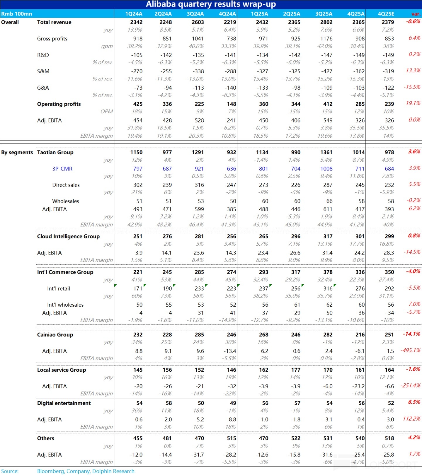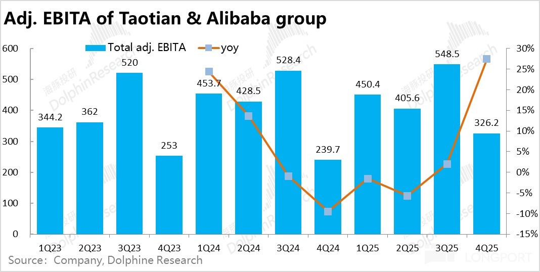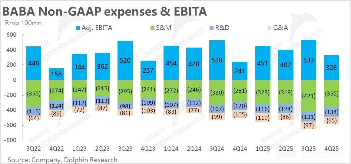 利潤上,同樣盡管淘天利潤增長超預期,但包括阿裡雲、菜鳥、尤其是本地生活業務的大幅虧損,使得阿裡集團本季adj.EBITA利潤326億只是和預期一致。同比角度,由於去年同期的低基數,利潤同比增長達35.5%,絕對角度並不差,但是相比預期沒有亮點。