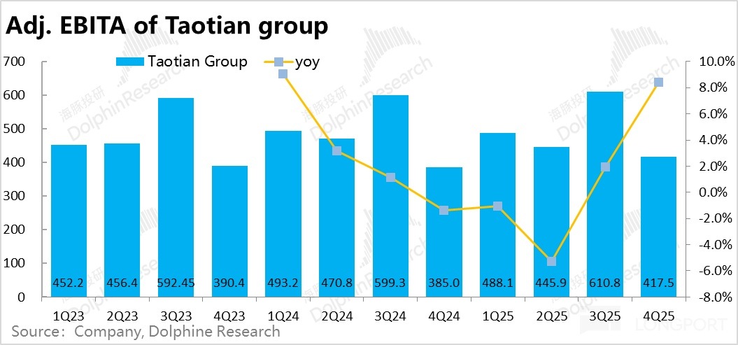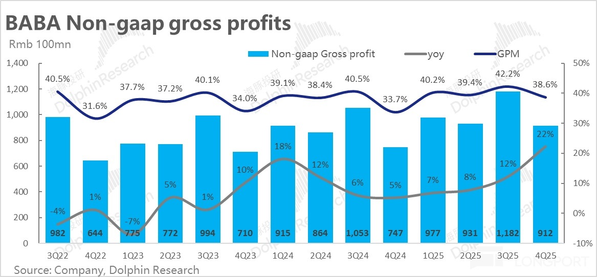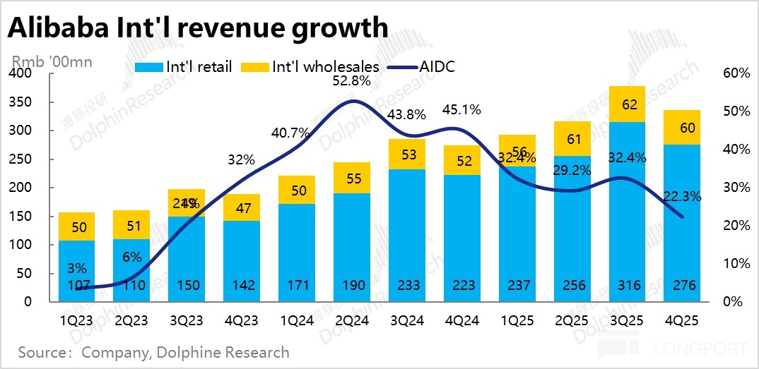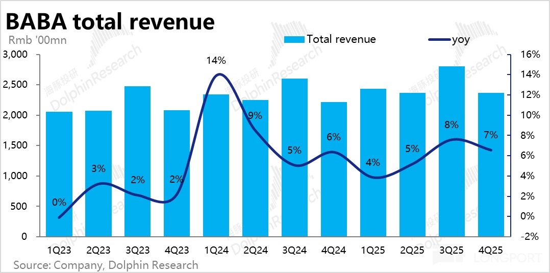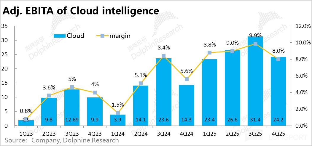 因此對這塊業務,市場和海豚的預期大體只是「不拖後腿」就好,保持中高個位數的收入增速,和稍高些的盈利增速,維持當前的估值水平。不要在AI雲業務拉高集團整體估值時,由於淘天表現疲軟造成拖累就已足夠。那麼此次業績應當是達成了這個要求的。