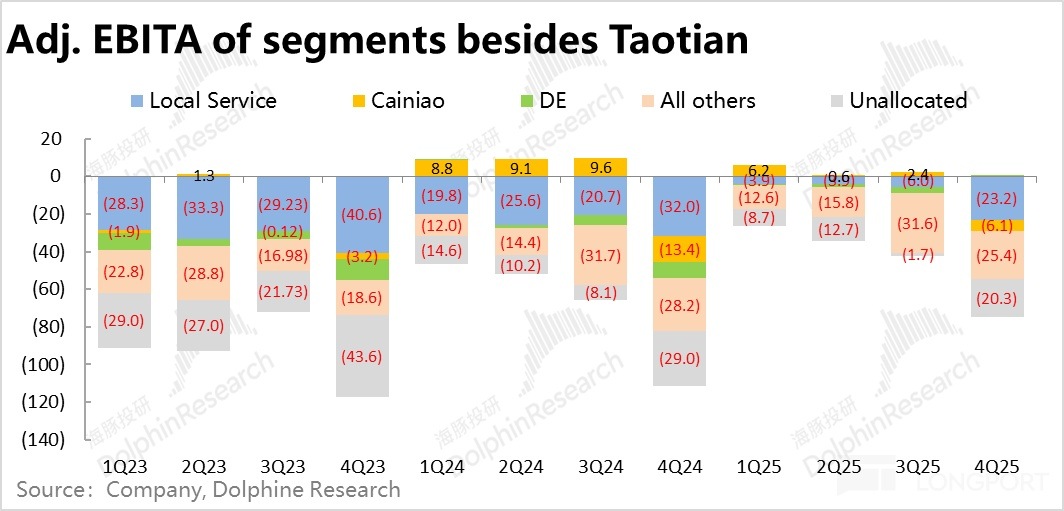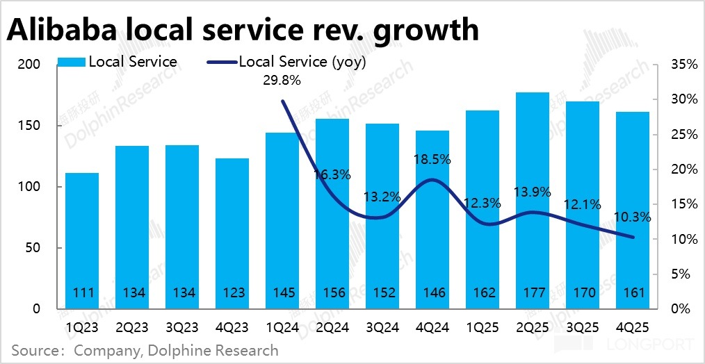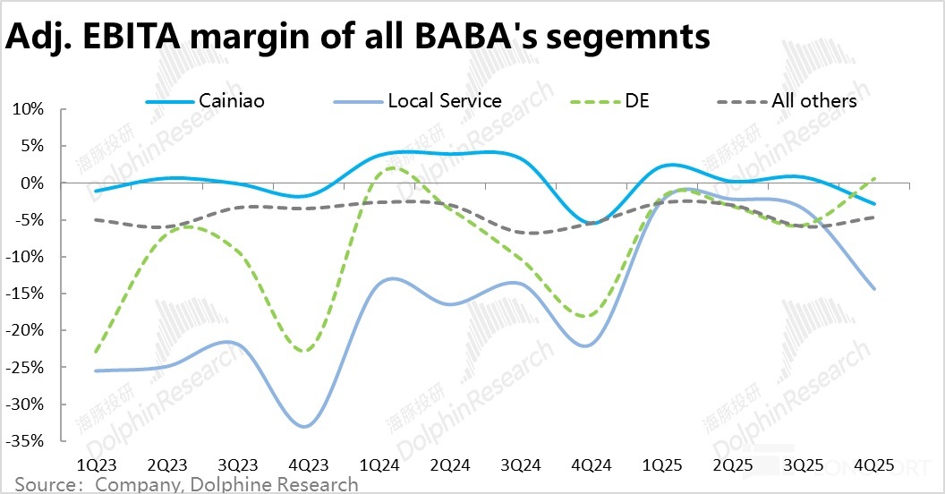 阿裡本地服務本季度收入增長10.3%,環比略降1.8pct,增長趨勢還算平穩。但問題在於,本地生活部門本季的虧損大超預期(-6.6億)達到23.2億。雖然本季確實屬一年内的利潤季節性低點,但相比25財年前三個季度都在6億以下的單季虧損幅度,本季大幅增加的虧損,顯然用季節性變化並不能完全解釋。