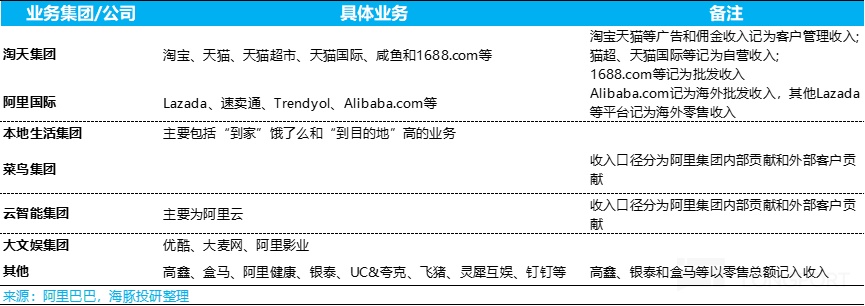 7)其餘所有:高鑫(傳言可能被出售)、盒馬、阿裡健康、銀泰(這三個屬含綫下業態的自營新零售,原來在國内商務業務中);靈犀互動、UC、誇克(原泛娛樂業務中),飛豬(原本地生活業務中)、釘釘(原在雲業務中)。
