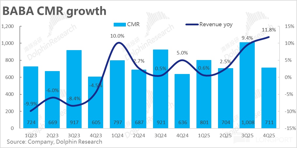 本季CMR實際增長11.8%,即便相比於JPM為代表的「真實」市場預期,也仍然更好。我們認為這是國補帶動下電商行業整體在1Q增長不錯,以及淘天自身加收的0.6%服務費和全站推廣告工具的利好在進一步釋放。
