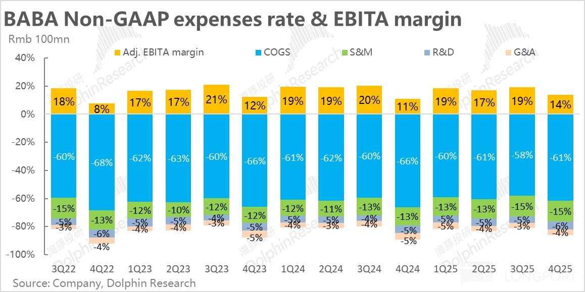 類似的,彭博預期顯示adj.EBITA利潤同比增長2.1%顯然也過於偏低,實際本季淘天adj.EBITA為418億,同比增長約8%,相比JPM反映的更準確預期的7%,也同樣是個不錯的beat。體現了淘天變現率走高,自然對利潤也有正向帶動。淘天集團利潤率相比去年同期也僅微降0.1pct,標誌著原先因業務調整,變現率下滑,投入擴大導致的利潤率下滑周期終告結束。