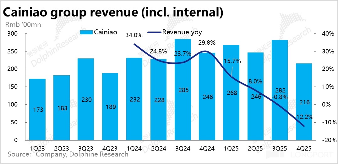 六、業務剝離影響下,菜鳥收入負增長幅度擴大