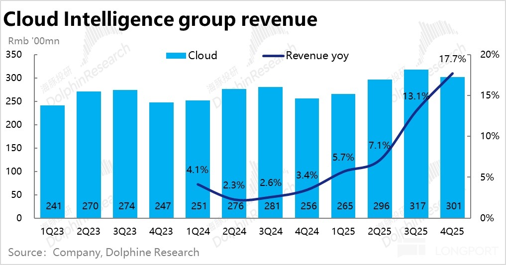 作為此輪國内AI故事下,最直接受益的資産之一,市場對阿裡雲增長再提速已有充分的共識,賣方預期中值大體為17%,部分樂觀的賣方或投資者預期更是達20%上下。實際表現上,本季阿裡雲業務收入301億,同比增長17.7%,雖確實如期提速,但顯然並沒大幅超過投資人的預期區間。