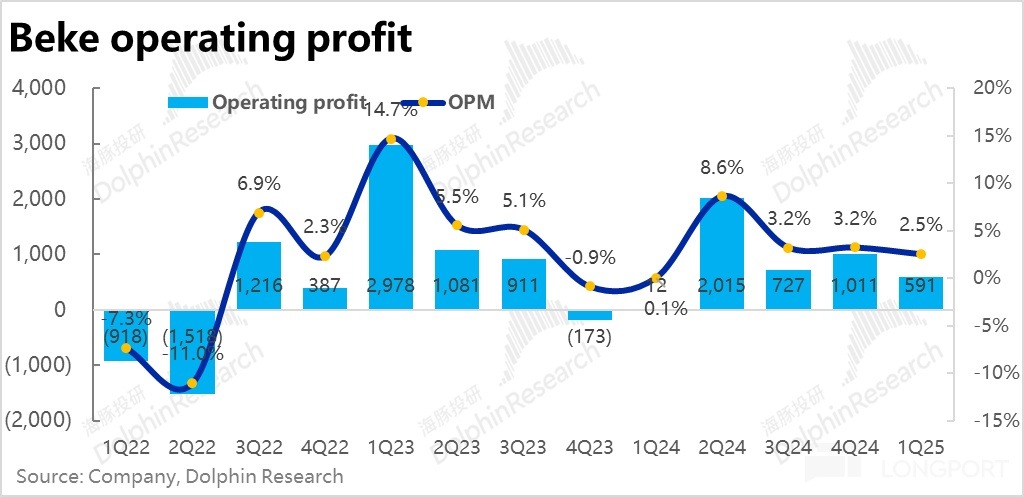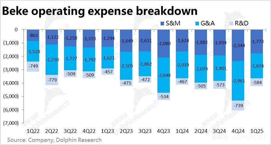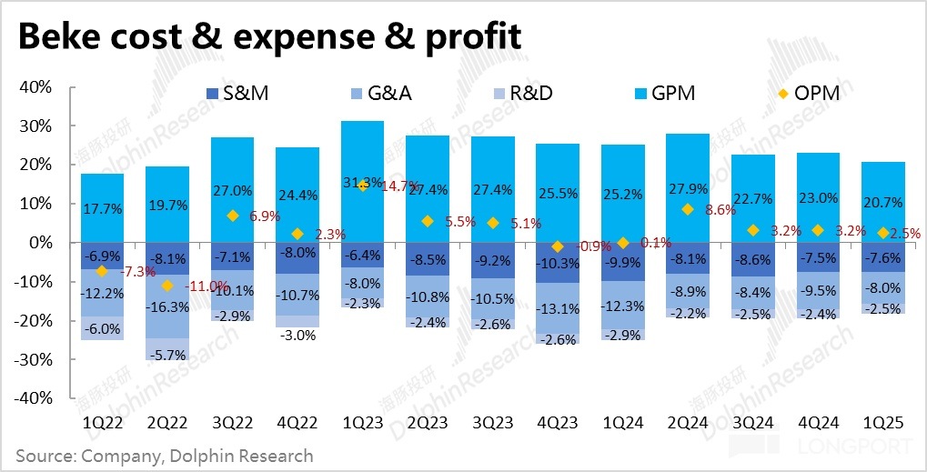 費用層面,本季貝殼三費合計同比僅增長了 3%(主要是去年基數太低)。實際環比角度看,本季費用支出下降了約 3 成,相比收入環降 25%,費用支出不算特別保守。