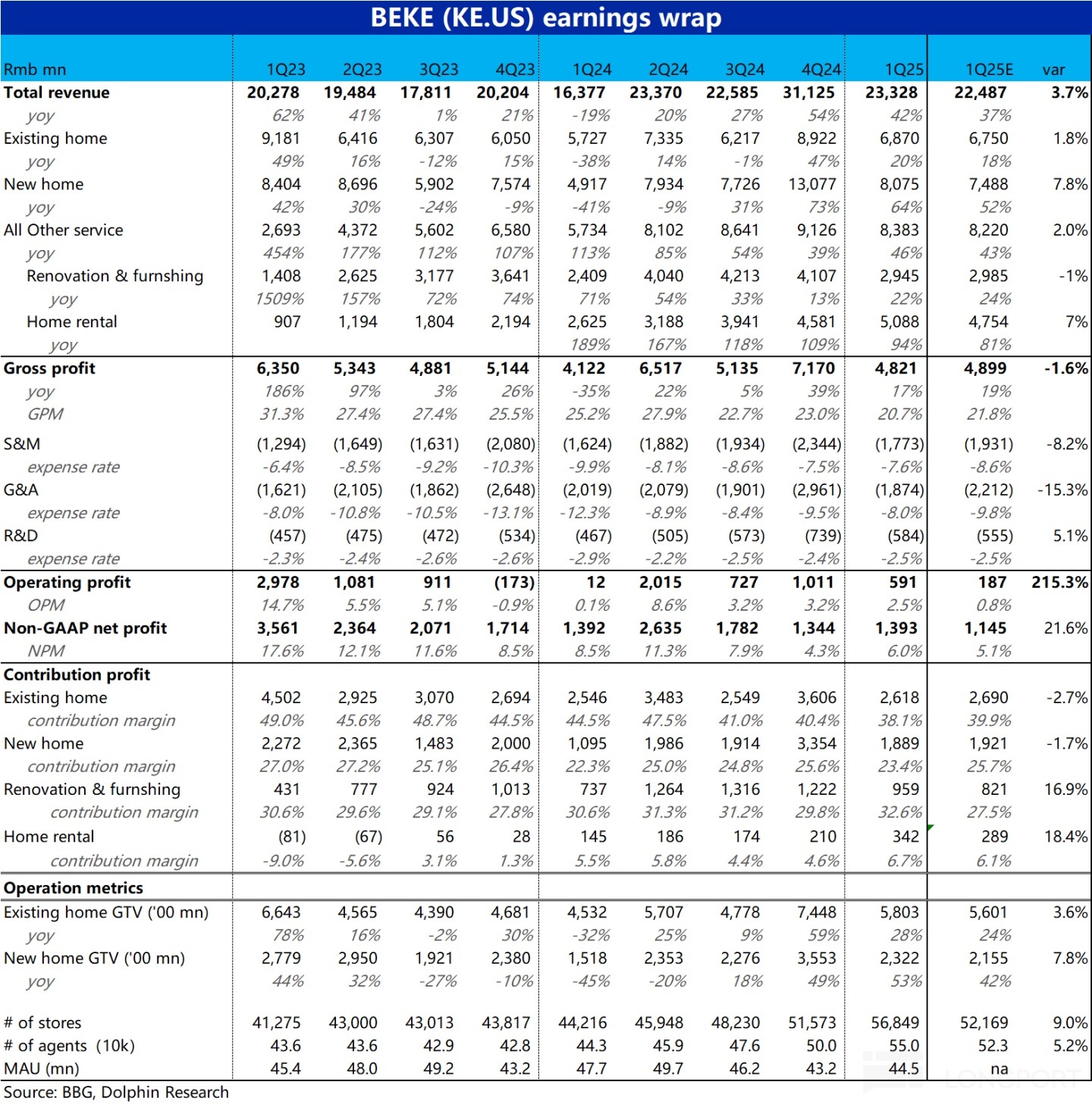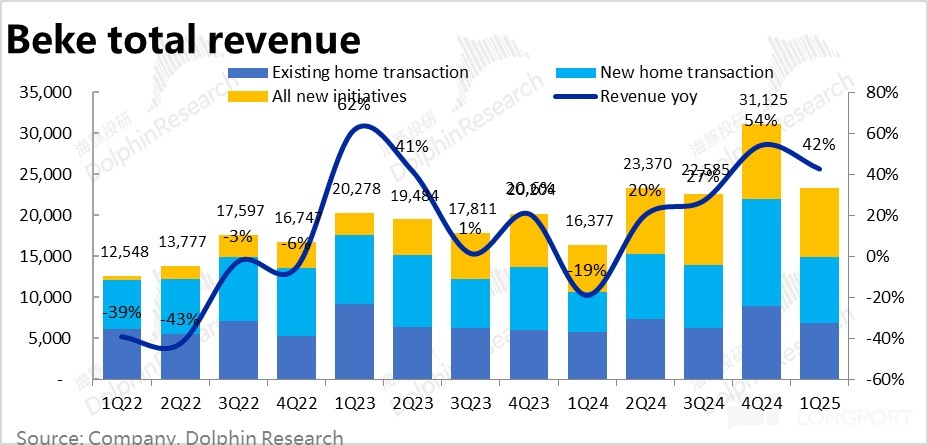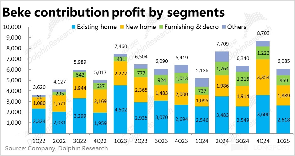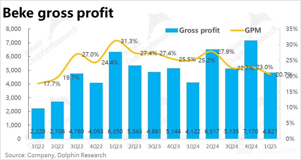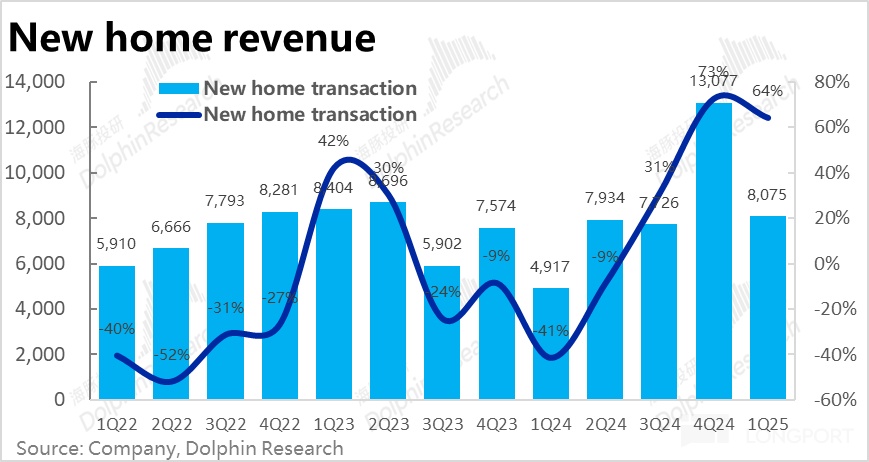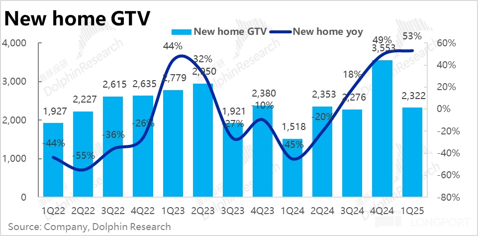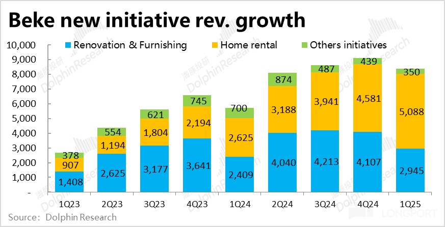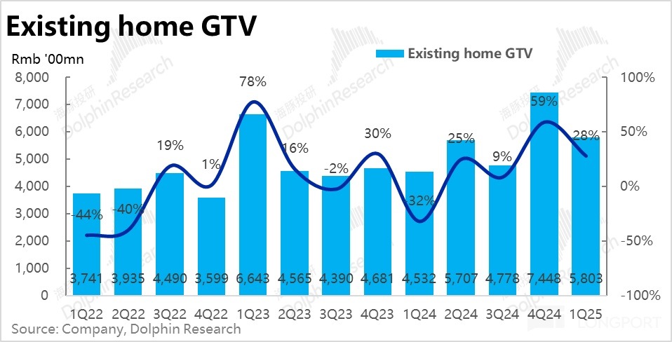 核心中核心的存量房業務,本季 GTV 為 5803 億,同比增加了 28%。雖不及去年 4 季度支持政策剛推出時那麼強勁,政策紅利的餘溫仍在。相比市場預期的 24%,也是不錯的 beat。據公司電話會中的披露,貝殼研究院調研的全國二手房成交額同比增長了 17%,可見貝殼作為龍頭的市佔率仍在穩步提升。