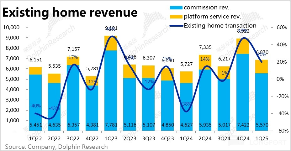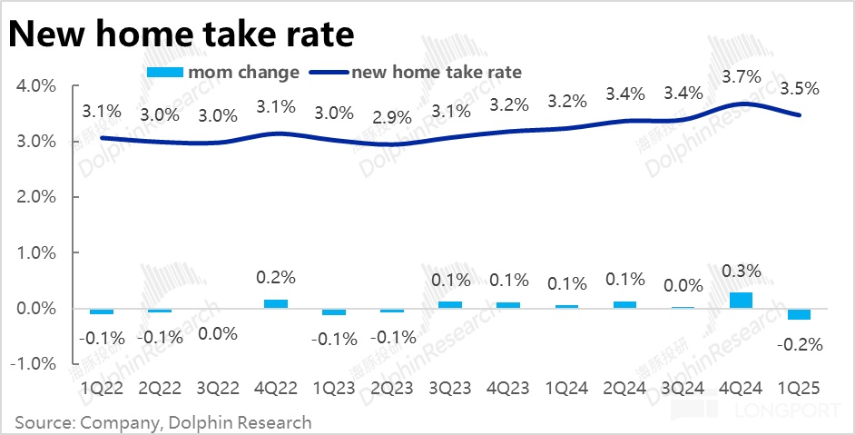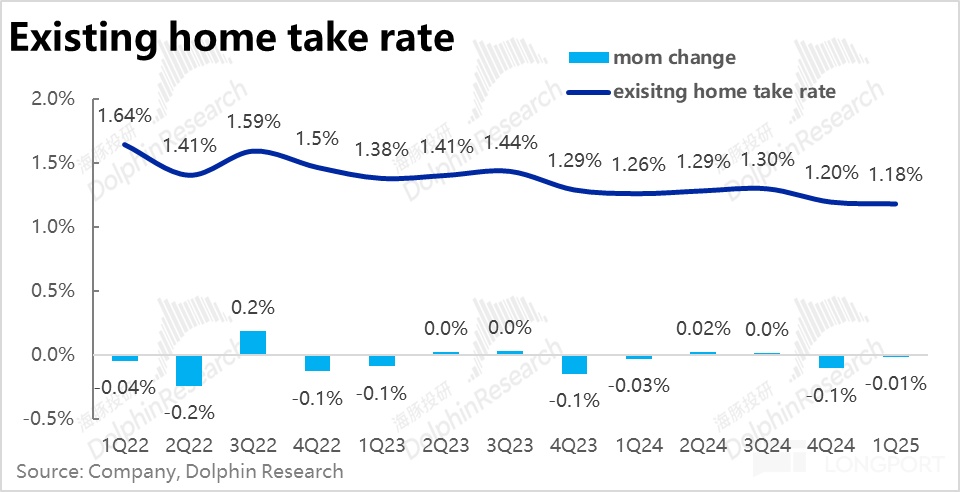 營收上,存量房業務的營收增長 20%,雖也不錯且跑贏市場預期的 18%,但可見收入增速低於成交額增速。也體現為公司本季二手房的綜合佣金率再度環比下降了 1.4bps 到 1.18%。