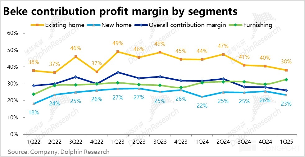 整體來看,貝殼本季整體的貢獻利潤率為 26.1%,環比來看下降了 1.9pct。同樣是在營收顯著增長的同時,利潤率卻繼續在收縮(尤其是一航道的房屋中介業務)。再度呈現增收不增利的問題。
