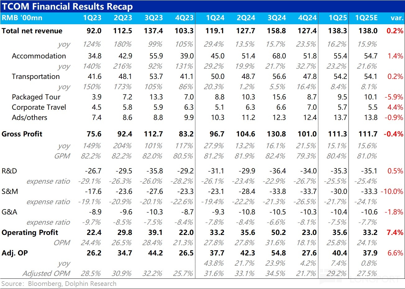 北京時間 5 月 20 日早美股盤後,$攜程網(TCOM.US) 公佈了 2025 財年 1 季度財報,詳細要點如下: