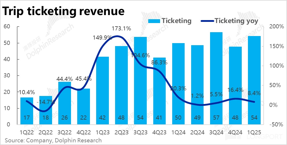 票務業務的收入增速則為 8.4%,又跌回個位數增長,但在市場預期之内。主要是國内和出境機票價格較去年都同比下滑了約 10%~15%,拖累了收入的增長。