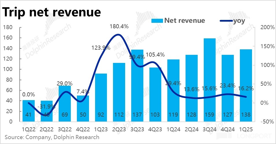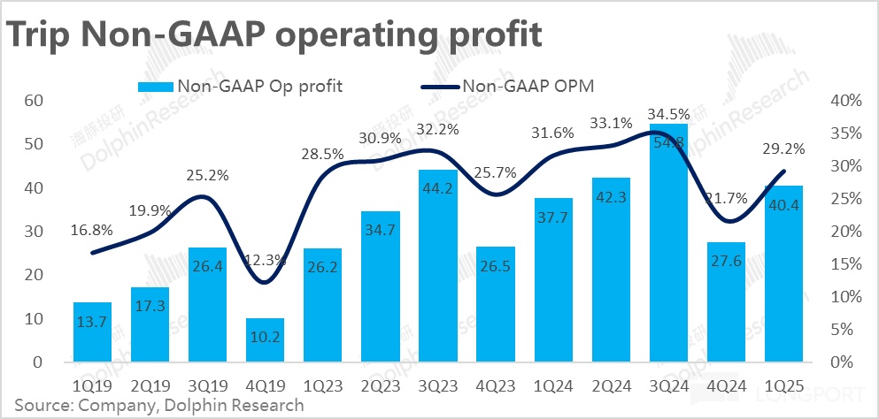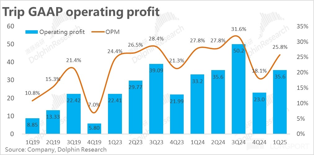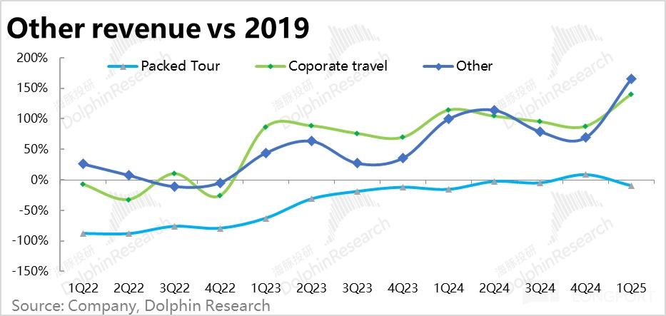 從本季的表現看,無論是入境還是純海外業務都依舊保持了三位數% 和大雙位數% 的增長,絕對表現顯然仍非常強勁,但邊際角度,這兩項業務的增長本季也並沒遊進一步提速。後續來看,隨著基數的走高,以及特朗普關稅對跨境遊的影響可能反而是比國内遊影響更大的,能維持目前的增速、穩步放緩應當也屬不錯了。