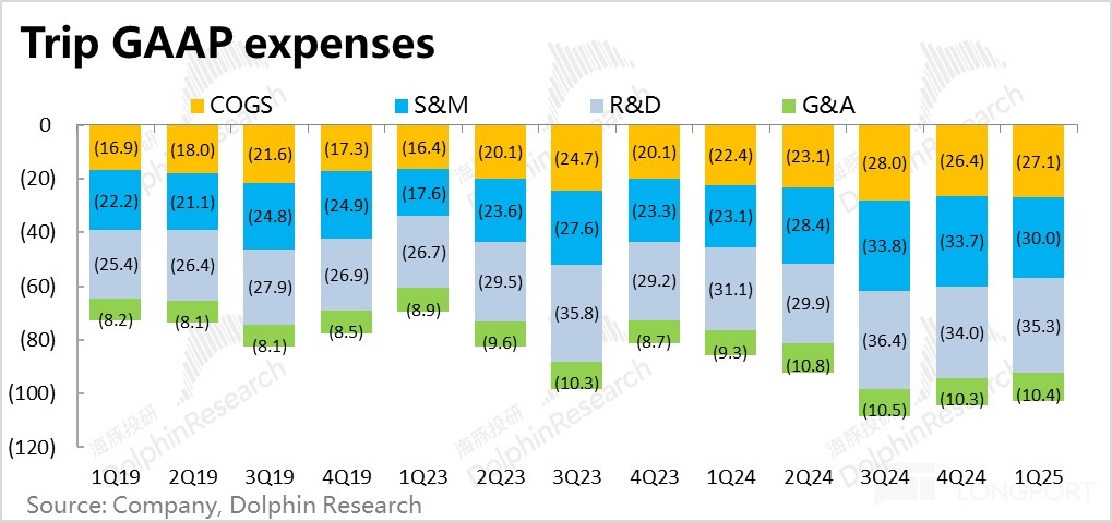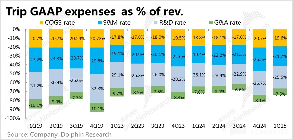 5、成本和費用上,本季攜程的毛利率為 80.4%,相比預期的 81% 偏低,同比也是收縮的,表現不及預期。一方面,是營收結構上利潤率更低的海外業務佔比走高。另一方面,本季酒店客單價和機票價格都同比下滑,對毛利率應當也有拖累。