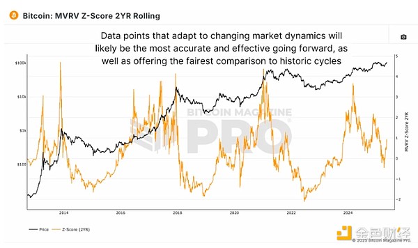為了衡量加密貨幣投資者的心理,兩年滾動 MVRV-Z 評分提供了關鍵見解。這一高級指標考慮了丟失的代幣、流動性不足的供應、不斷增長的 ETF 和機構持倉,以及比特幣長期持有者行為的變化。