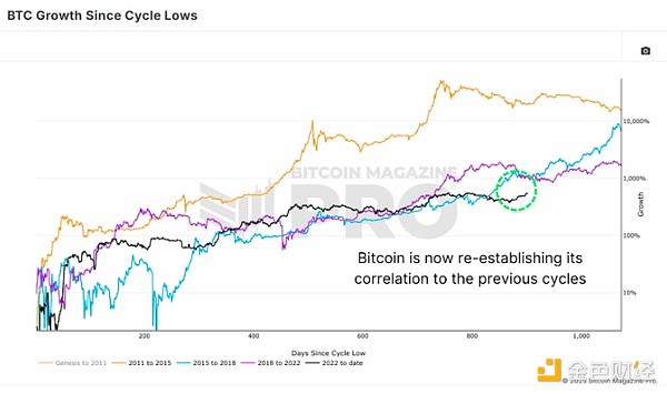 最近的比特幣價格飙升刷新了人們的預期。根據「周期低點以來比特幣的增長」圖表,盡管面臨宏觀挑戰和回調,但比特幣的走勢與 2016-2017 年和 2020-2021 年的周期走勢高度一致。