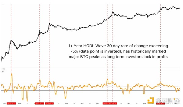 圖 4:一年以上持幣觀望浪潮的變化率表明,市場對未來比特幣價格充滿信心。