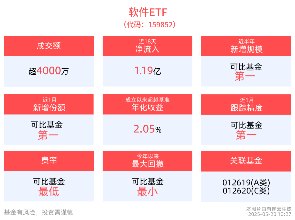 流動性方面,軟件ETF盤中換手1.4%,成交4020.62萬元。拉長時間看,截至5月19日,軟件ETF近1月日均成交1.92億元,排名可比基金第一。