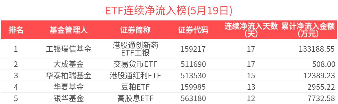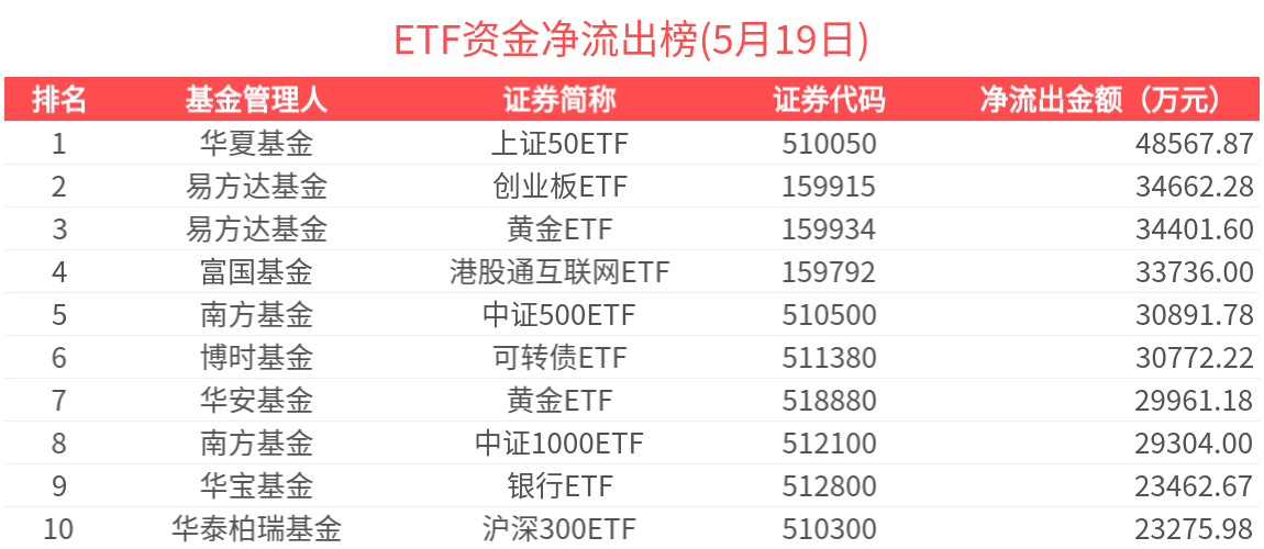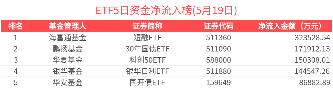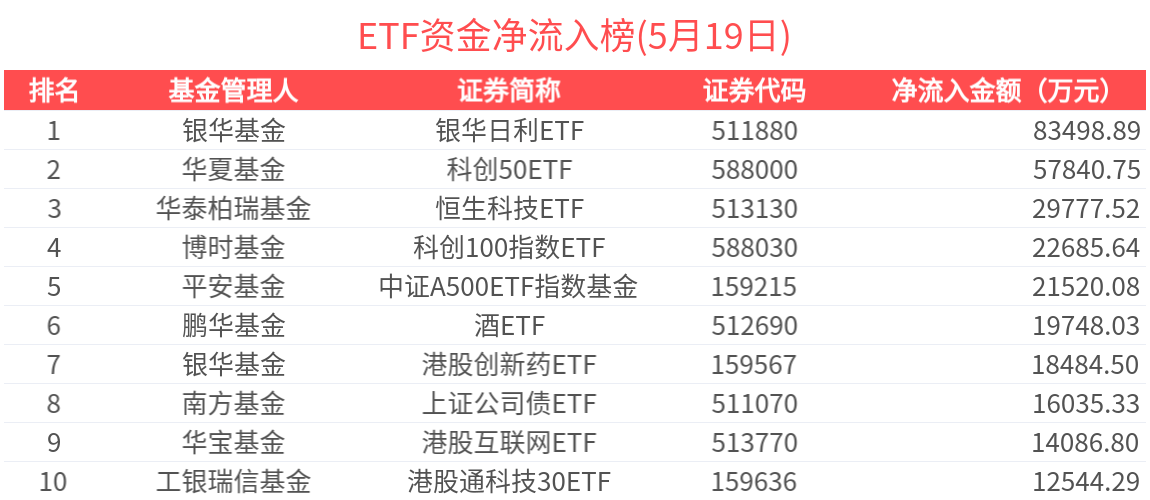 2025年5月19日共161只ETF基金獲資金淨流入,402只ETF基金淨流出。淨流入金額超1億元的有15只,銀華日利ETF(511880.SH)、科創50ETF(588000.SH)、恒生科技ETF(513130.SH)、科創100指數ETF(588030.SH)、中證A500ETF指數基金(159215.SZ)資金顯著流入,分別淨流入8.35億元、5.78億元、2.98億元、2.27億元、2.15億元(淨申購份額*單位淨值)。