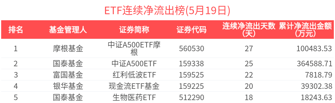 連續淨流出的ETF基金有235只,居前的為中證A500ETF摩根(27天)、中證A500ETF(25天)、紅利低波ETF(22天)、現金流ETF基金(20天)、生物醫藥ETF(18天),分別淨流出10.05億元、36.46億元、7818.79萬元、3.93億元、1.82億元。其中,紅利低波ETF近22天加速流出,近22天累計流出7818.79萬元,基金規模快速下降至2.53億元。