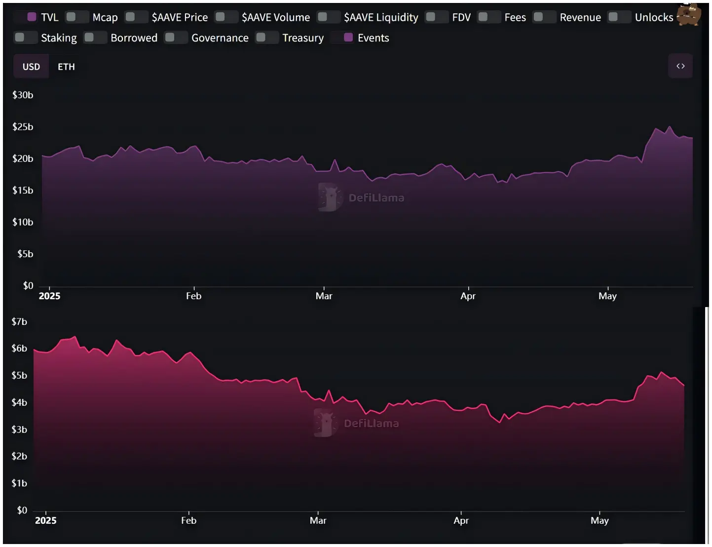 從市場數據來看,這種「抱團效應」正在釋放積極信號。5 月以來,Aave 的 TVL 從 197.08 億美元上漲至 233.47 億美元,漲幅超過 18%。Uniswap 的 TVL 同期也增長了約 11%,從 41.78 億美元升至 46.5 億美元。兩者同時走強,可能並非巧合。