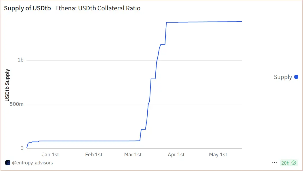 USDtb 是一種無收益但全額抵押的穩定幣,資産由貝萊德的代幣化貨幣市場基金(BUIDL)與 USDC 構成。當前鏈上供應超過 14.4 億美元,抵押率維持在 99.4%。與 USDe 的策略性對沖不同,USDtb 更像是「鏈上美元」,為機構提供可依賴的、無波動的穩定錨點。特別是在市場出現負資金利率時,Ethena 可將 USDe 的對沖資金轉移至 USDtb,以穩定整個資産池結構。