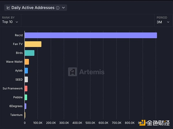 SocialFi 平台尤為突出,其中 RECRD(一個短視頻内容變現平台)在過去三個月中一直是 Sui 的頂級應用,擁有約 100 萬日活躍用戶和超過 1 億筆交易。排名第二的是 FanTV,日活躍地址數為 12.8 萬,這是一個由人工智能驅動的平台,供創作者制作音樂、視頻和播客,同時用戶可以通過參與賺取代幣。